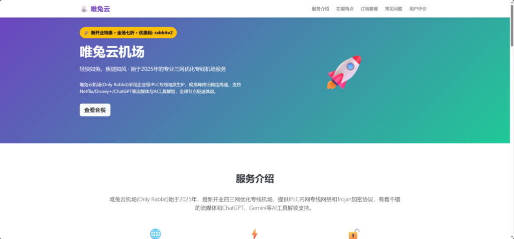 唯兔云机场 (Only Rabbit) 自 2025 年开业,致力于提供高效、稳定的三网优化专线服务。通过企业级 IPLC 内网专线和 Trojan 加密协议,确保即使在网络高峰时段也能保持高速稳定的连接,满足不同行业用户的需求。